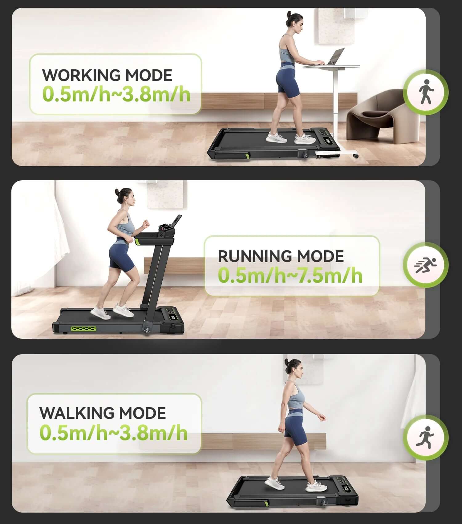 2.5HP Quiet & Powerful Walking Pad The portable treadmill is equipped with a self-developed 2.5HP motor for reduced energy loss, longer lifespan, and quieter operation. at the same time reduces the motor noise. 5-layer shock-absorbing running belt, allows you be in a quiet environment when you are exercising. The speed range is 06-7.5 mph.
