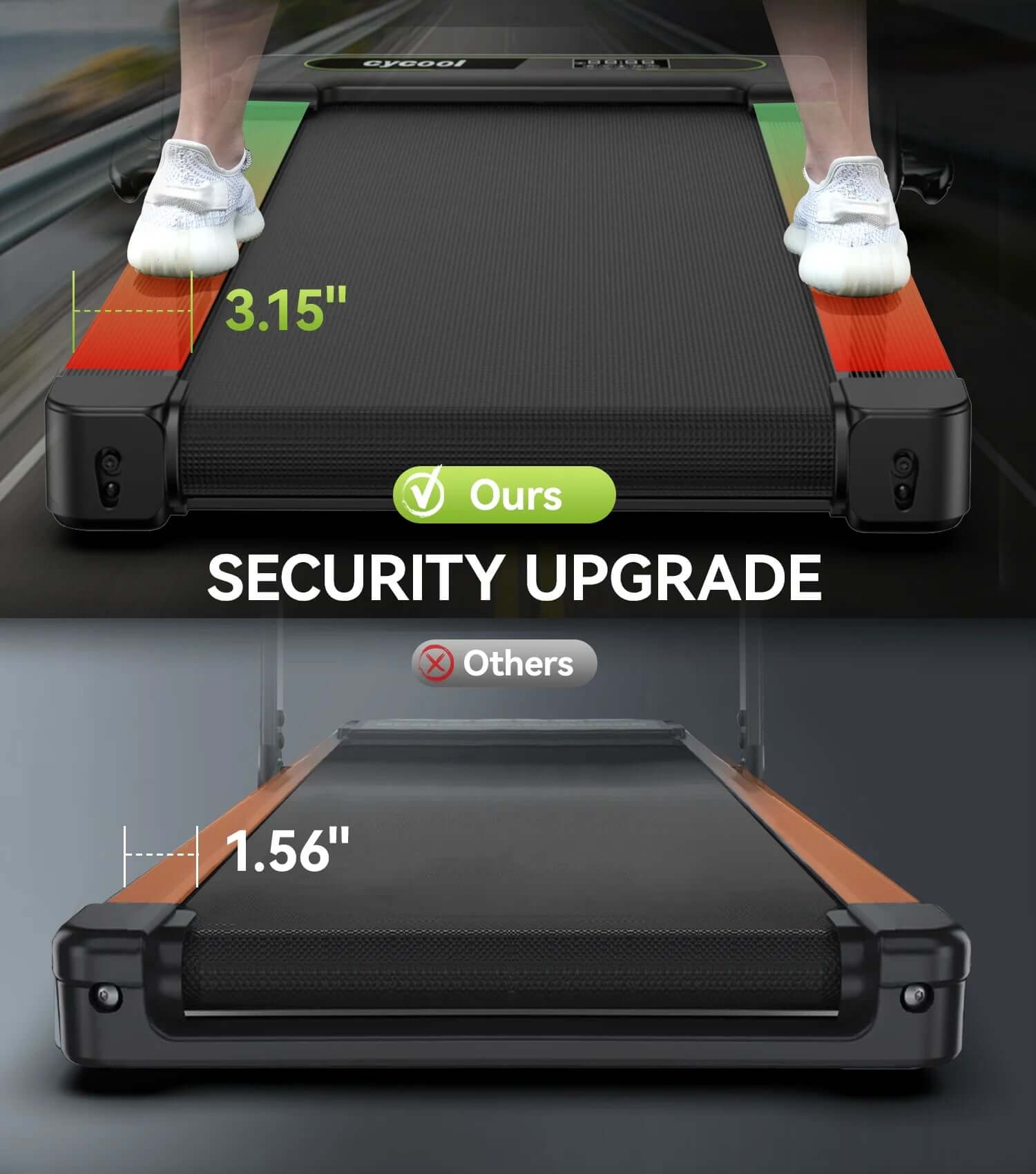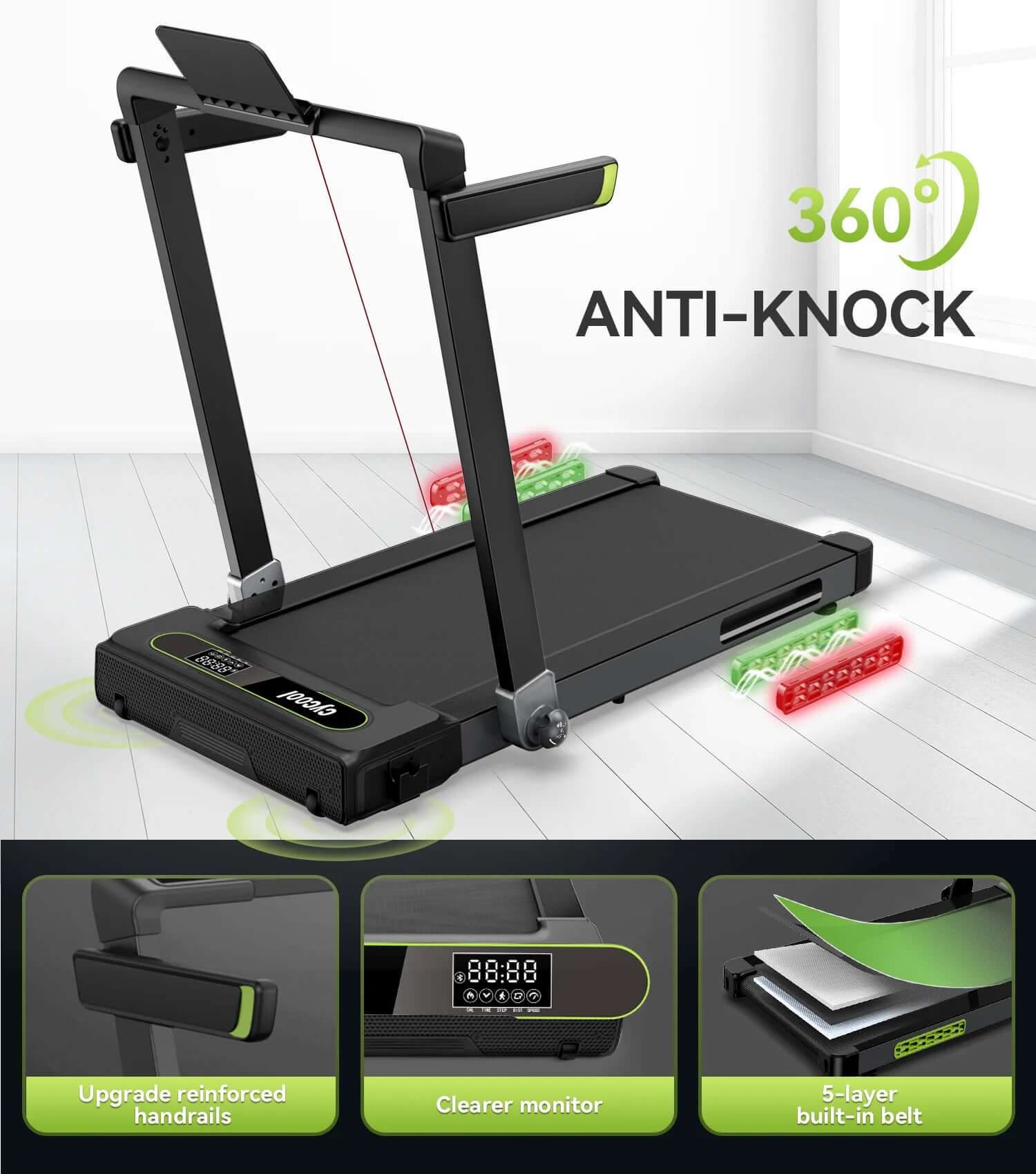 Larger Running Area & Professional Shock-Absorbing Design 16.5" wider anti-slip belt of the folding treadmill provides a safer and more comfortable experience for you, your family and pets while running. 5-layer anti-slip tough rhombus running belt and built-in 8 silicone shock-absorbers, all-round to protect your knees, ankles and joints.