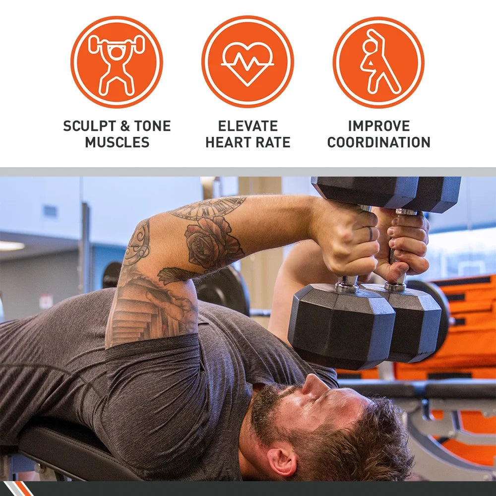 "Finally found commercial-quality dumbbells for my garage gym. These 60Lb Rubber Hex Dumbbells are built to last!" - Jessica R.